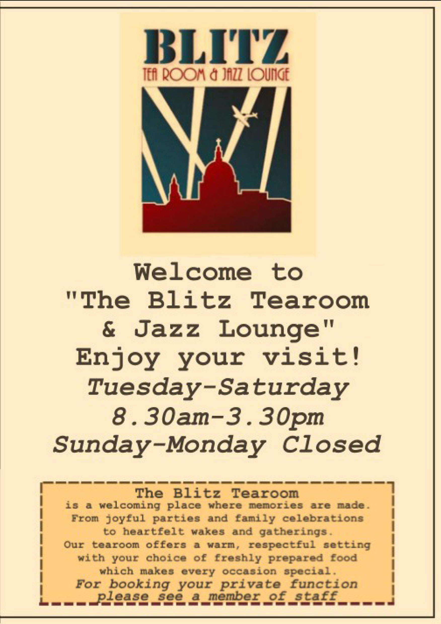 Whether you fancy dressing up in your best wartime glad rags or simply want to relax and soak up the atmosphere, The Blitz is the perfect place to be. We’re open from 9:00am to 4:30pm Tuesday to Saturday, with live 1940s music and themed evenings on select Fridays and Saturdays. Feeling peckish on a Monday? We can cater to special functions too, just give us a ring!