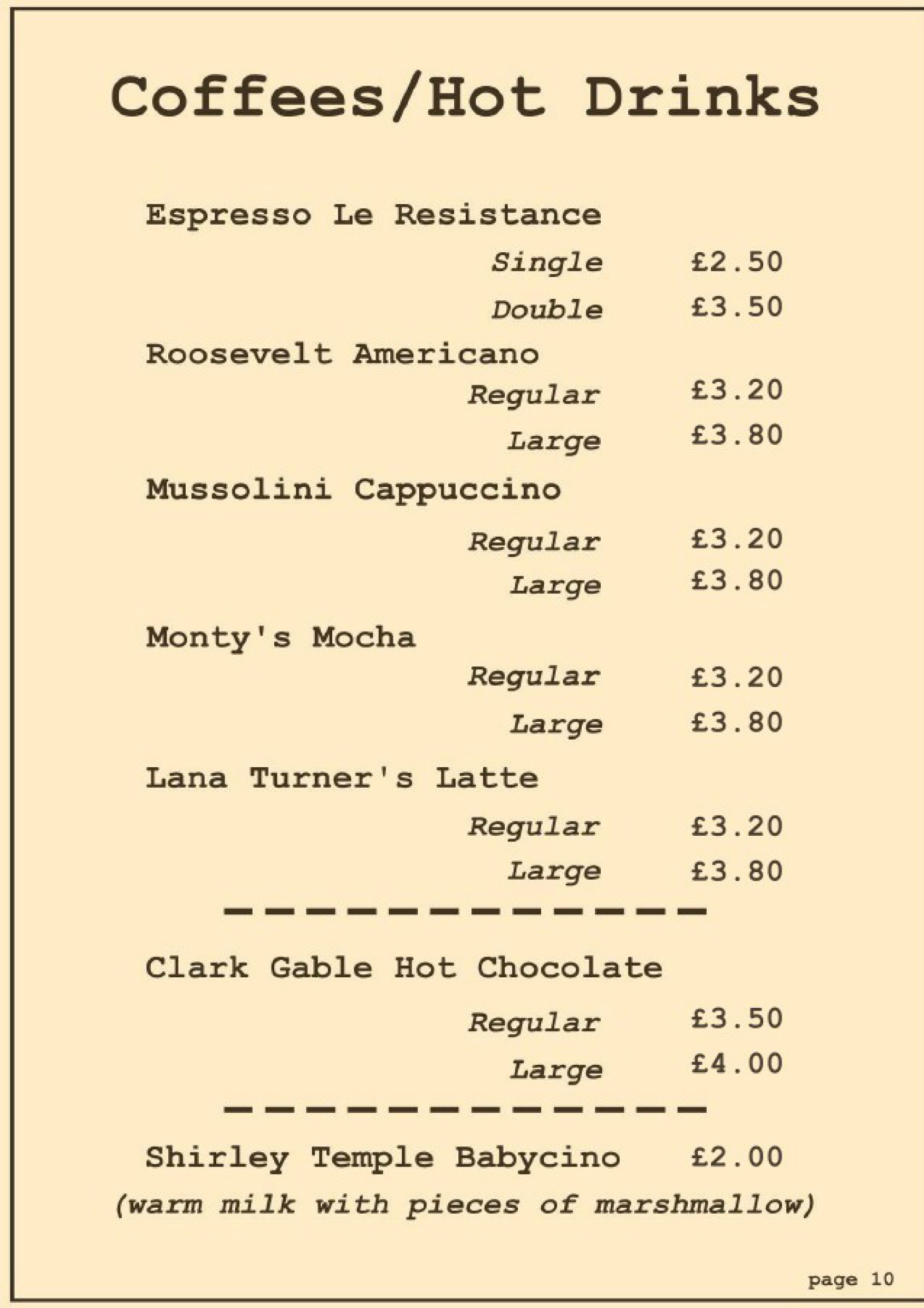Fancy a tipple with a wartime twist? We’ve got a Mussolini Cappuccino, a Lana Turner Latte, or even a Roosevelt Americano to tickle your taste buds. Feeling peckish? Sink your teeth into a Churchill mini pork pie with chutney, or perhaps the Vera Lynn platter, a delightful selection of miniature desserts, sandwiches, and scones – perfect for a spot of afternoon tea.