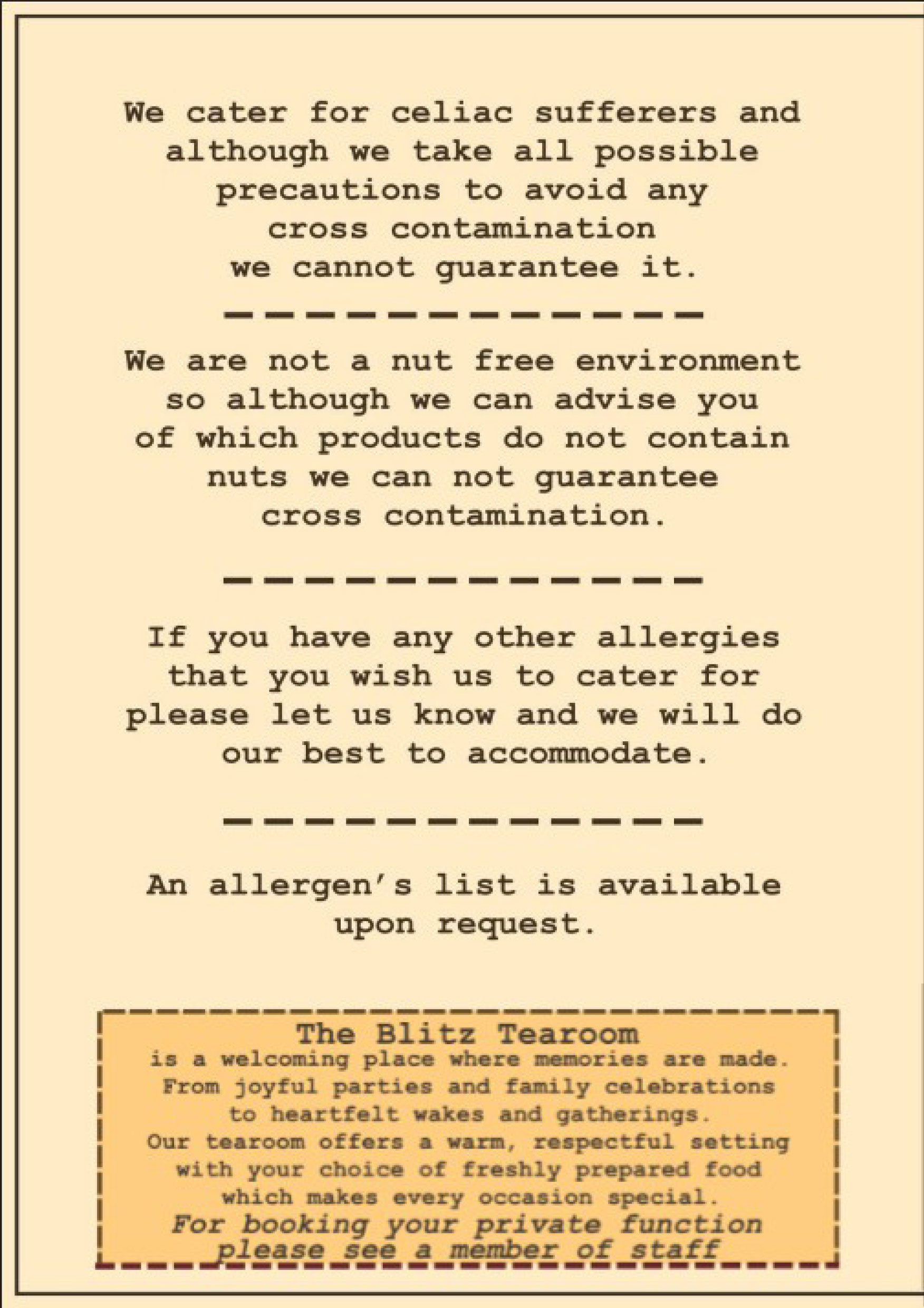 Walking into The Blitz is like stepping into a time machine. Our friendly staff will be there to greet you in their finest 1940s attire, ready to serve you a smashing cup of tea or coffee, delicious food, and scrumptious cakes. All this while you admire the unique ceiling, designed to evoke the spirit of the Blitz.