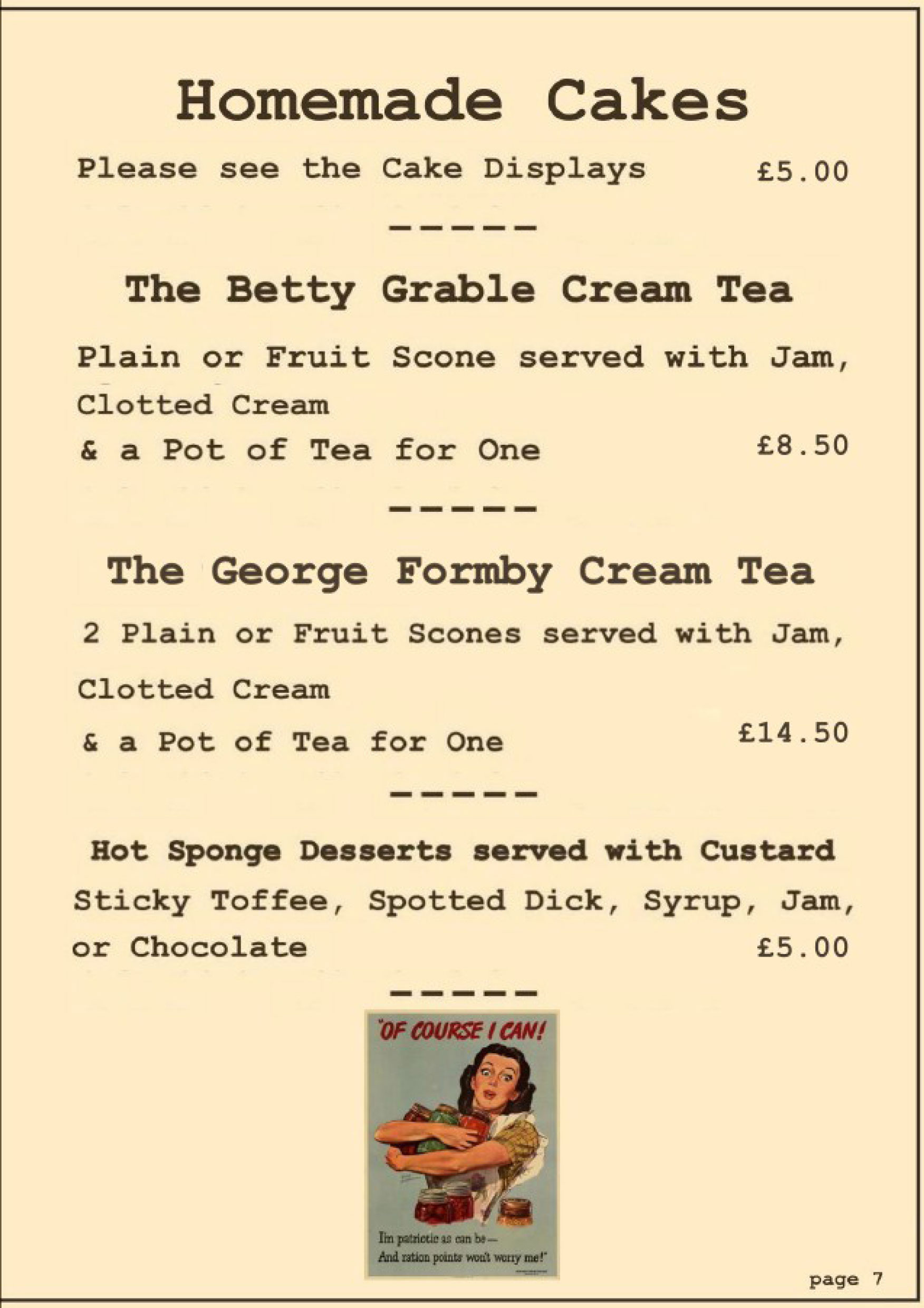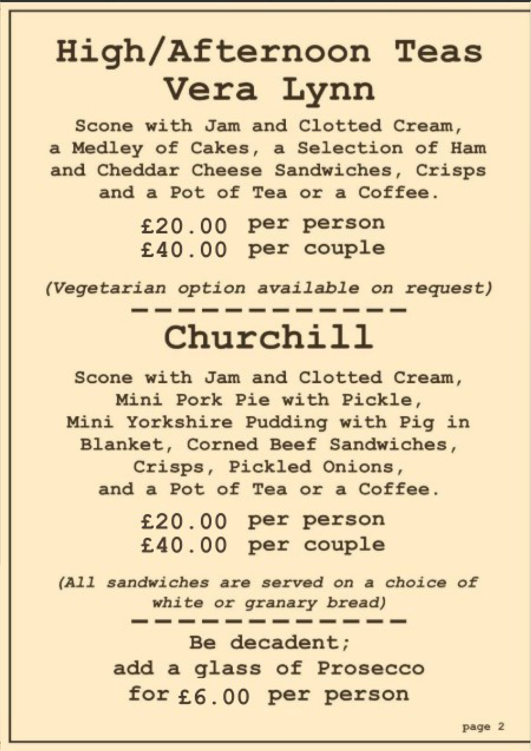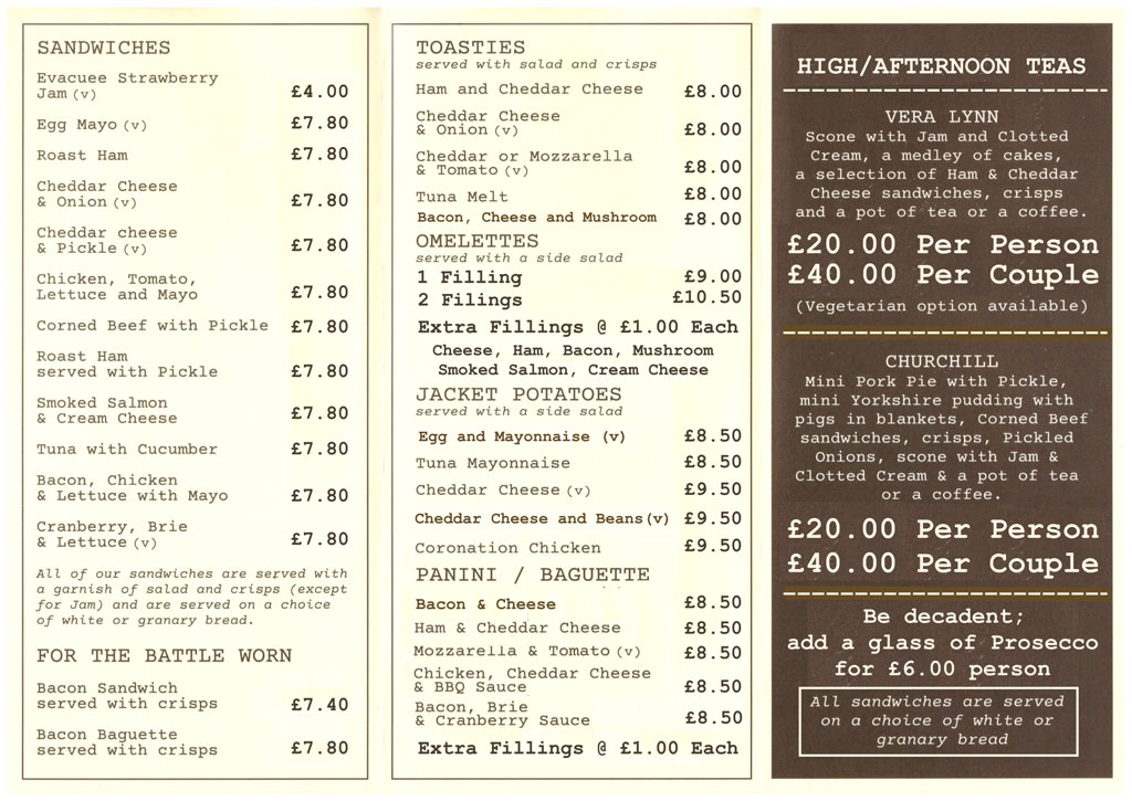 Don’t forget to peruse our “ration book” menu, brimming with delicious food and drinks. And for those who like a tipple with their tea, fear not – we’re fully licensed!