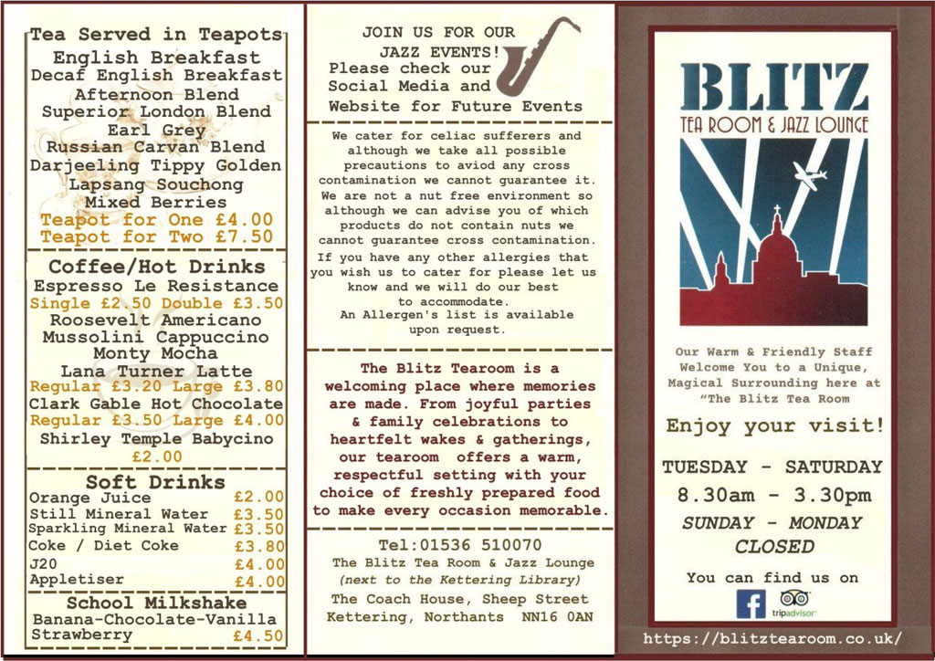 The Blitz Tea Rooms and Jazz Lounge in Kettering, the most spiffing and authentic 1940s tea room around. We serve a delightful selection of afternoon teas, lunches, and drinks, all in a cracking period setting that’ll have you feeling like you’ve stepped straight out of a wartime film.